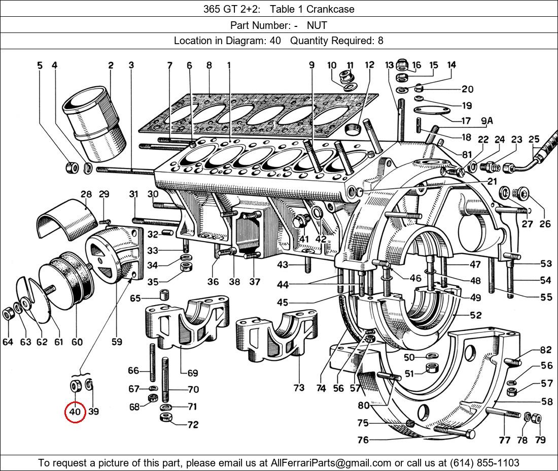 Ferrari Part Number -, NUT shown here as used in 365 GT 2+2 Table 1 Crankcase. Location in Diagram: 40. Required Quantity: 8