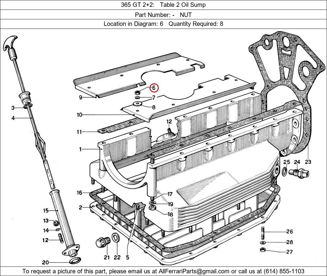 Ferrari Part Number -, NUT shown here as used in 365 GT 2+2 Table 2 Oil Sump. Location in Diagram: 6. Required Quantity: 8