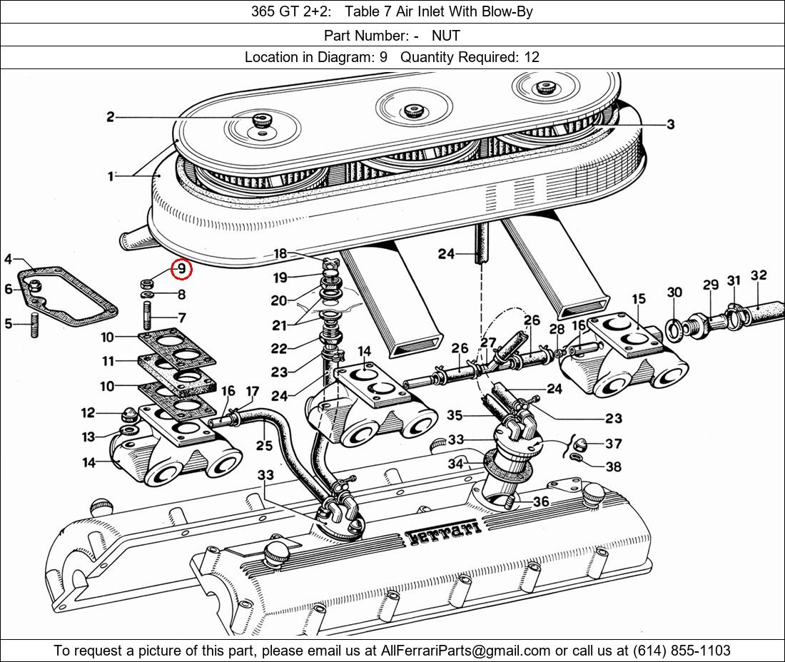 Ferrari Part Number -, NUT shown here as used in 365 GT 2+2 Table 7 Air Inlet With Blow-By. Location in Diagram: 9. Required Quantity: 12