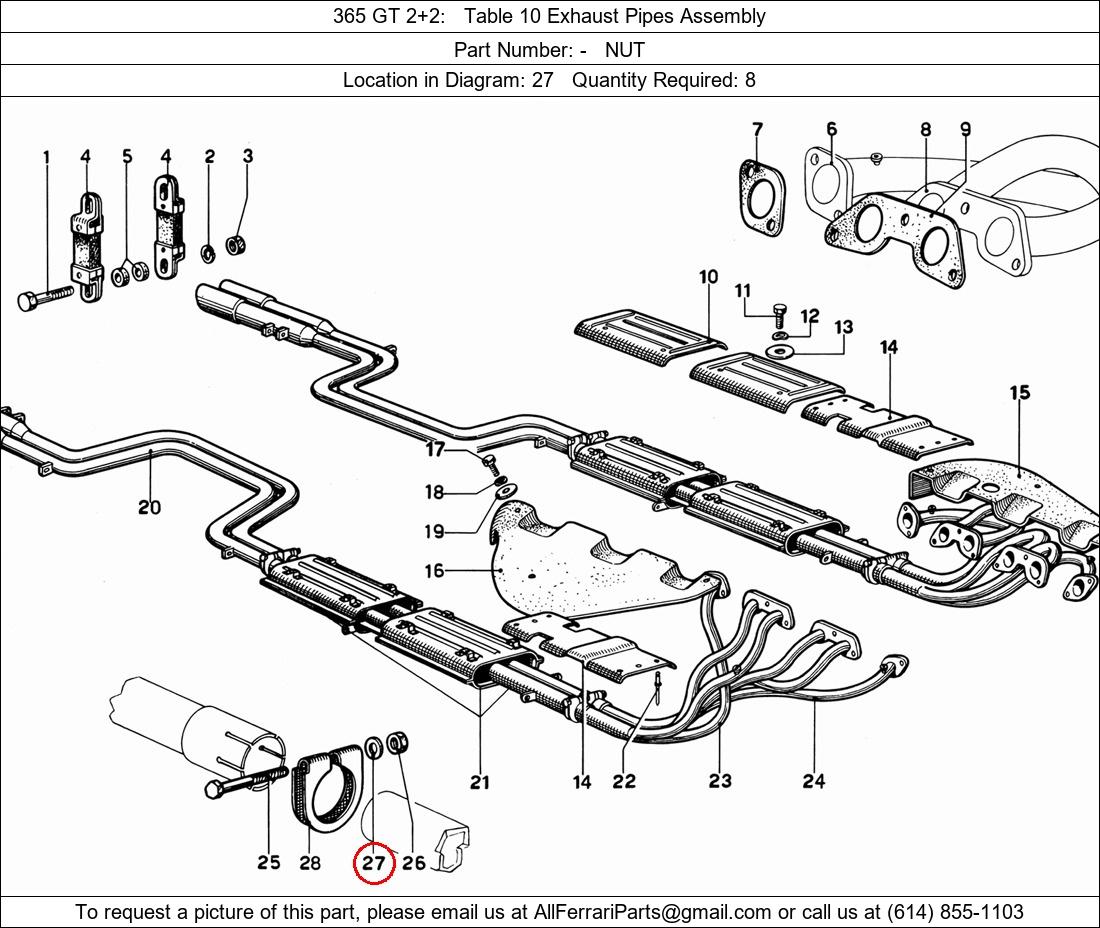 Ferrari Part Number -, NUT shown here as used in 365 GT 2+2 Table 10 Exhaust Pipes Assembly. Location in Diagram: 27. Required Quantity: 8