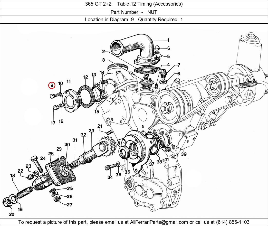 Ferrari Part Number -, NUT shown here as used in 365 GT 2+2 Table 12 Timing (Accessories). Location in Diagram: 9. Required Quantity: 1