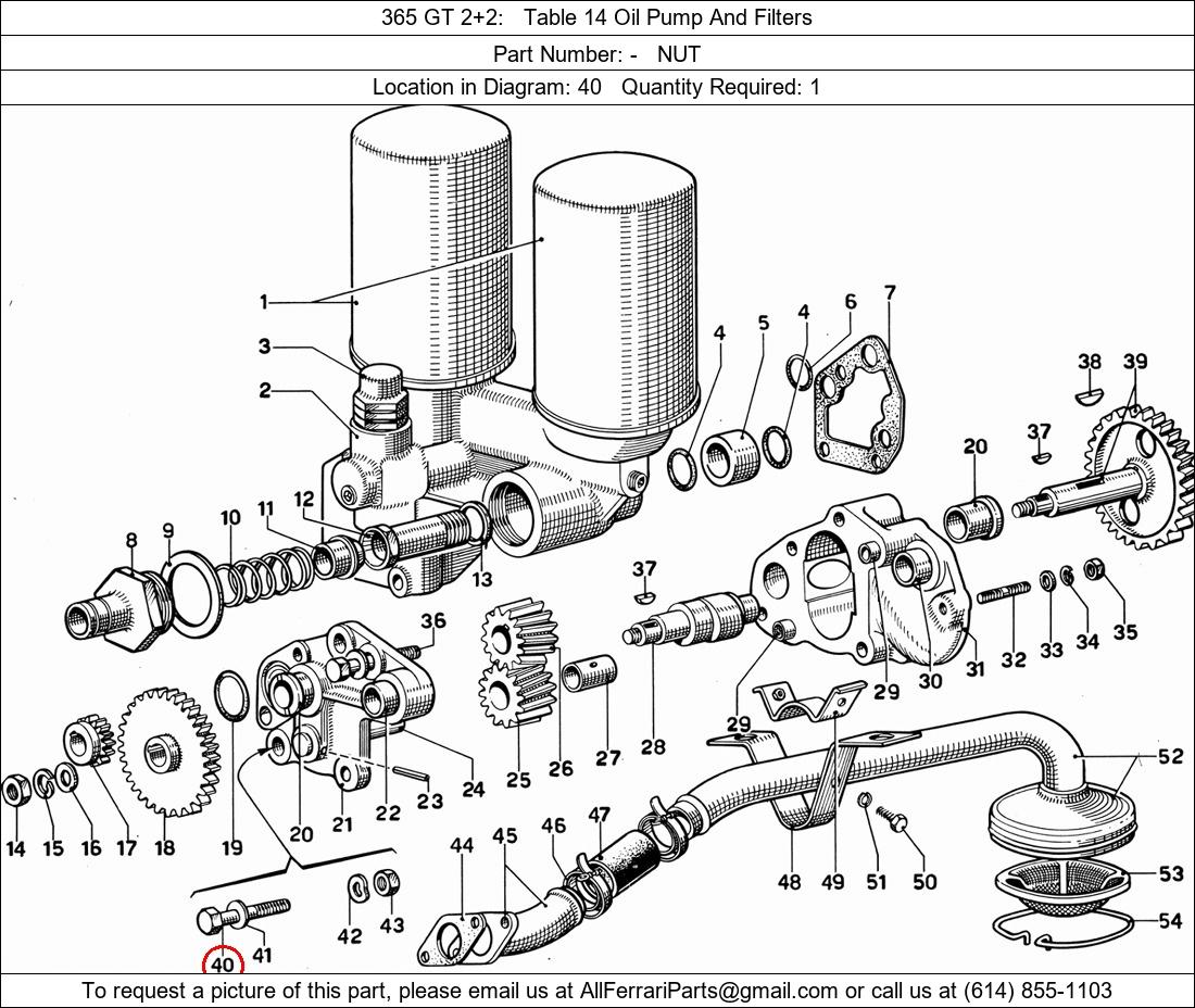 Ferrari Part Number -, NUT shown here as used in 365 GT 2+2 Table 14 Oil Pump And Filters. Location in Diagram: 40. Required Quantity: 1