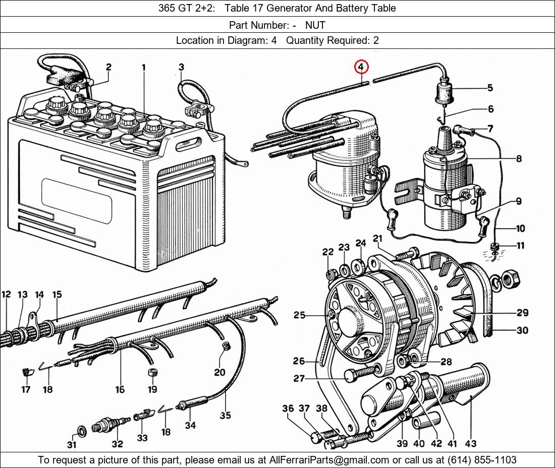Ferrari Part Number -, NUT shown here as used in 365 GT 2+2 Table 17 Generator And Battery Table. Location in Diagram: 4. Required Quantity: 2