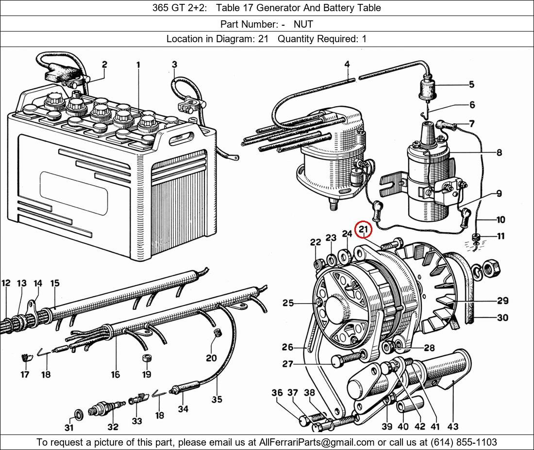 Ferrari Part Number -, NUT shown here as used in 365 GT 2+2 Table 17 Generator And Battery Table. Location in Diagram: 21. Required Quantity: 1