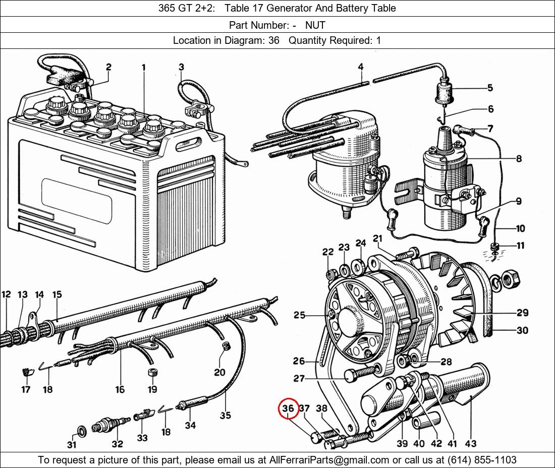 Ferrari Part Number -, NUT shown here as used in 365 GT 2+2 Table 17 Generator And Battery Table. Location in Diagram: 36. Required Quantity: 1