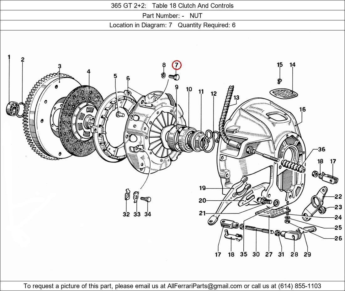 Ferrari Part Number -, NUT shown here as used in 365 GT 2+2 Table 18 Clutch And Controls. Location in Diagram: 7. Required Quantity: 6