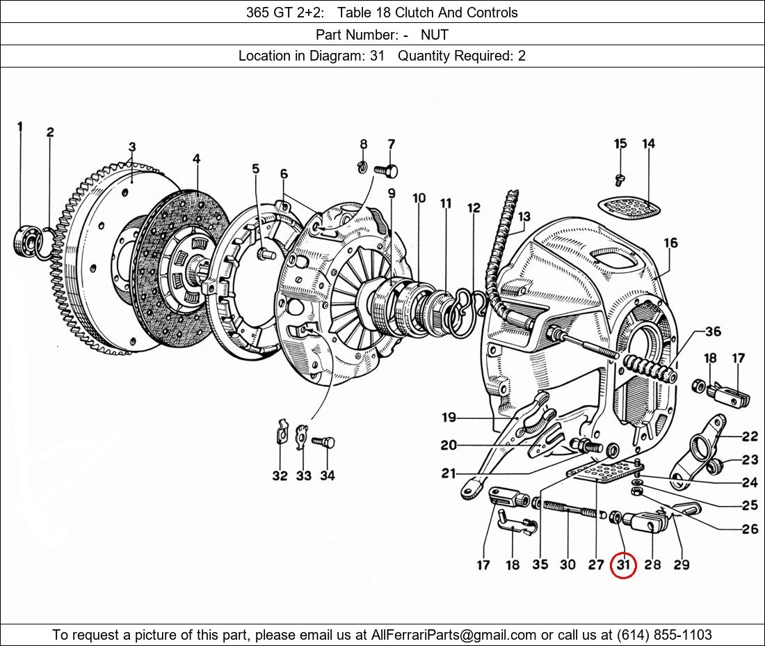 Ferrari Part Number -, NUT shown here as used in 365 GT 2+2 Table 18 Clutch And Controls. Location in Diagram: 31. Required Quantity: 2