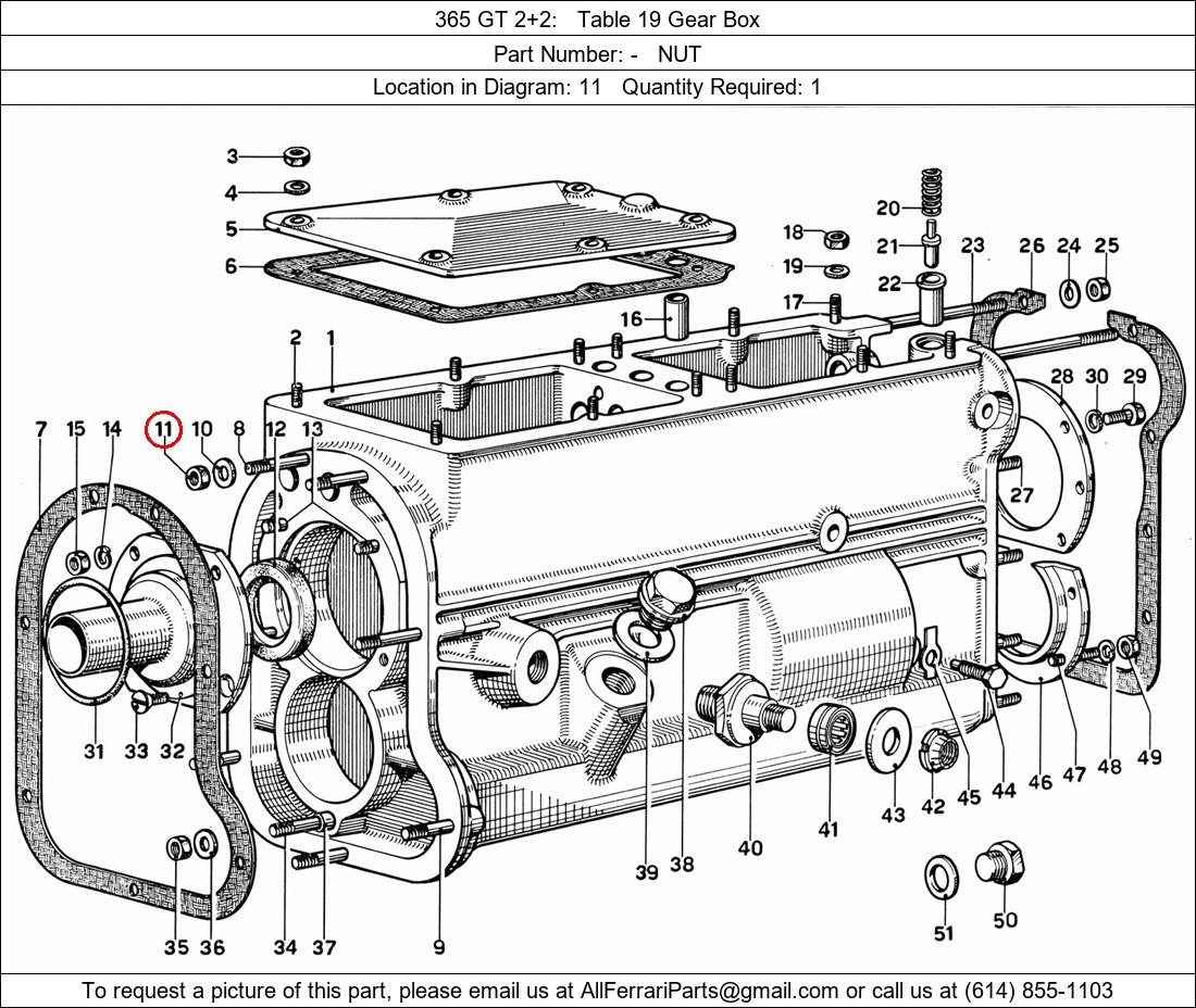 Ferrari Part Number -, NUT shown here as used in 365 GT 2+2 Table 19 Gear Box. Location in Diagram: 11. Required Quantity: 1