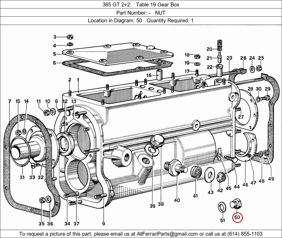 Ferrari Part Number -, NUT shown here as used in 365 GT 2+2 Table 19 Gear Box. Location in Diagram: 50. Required Quantity: 1