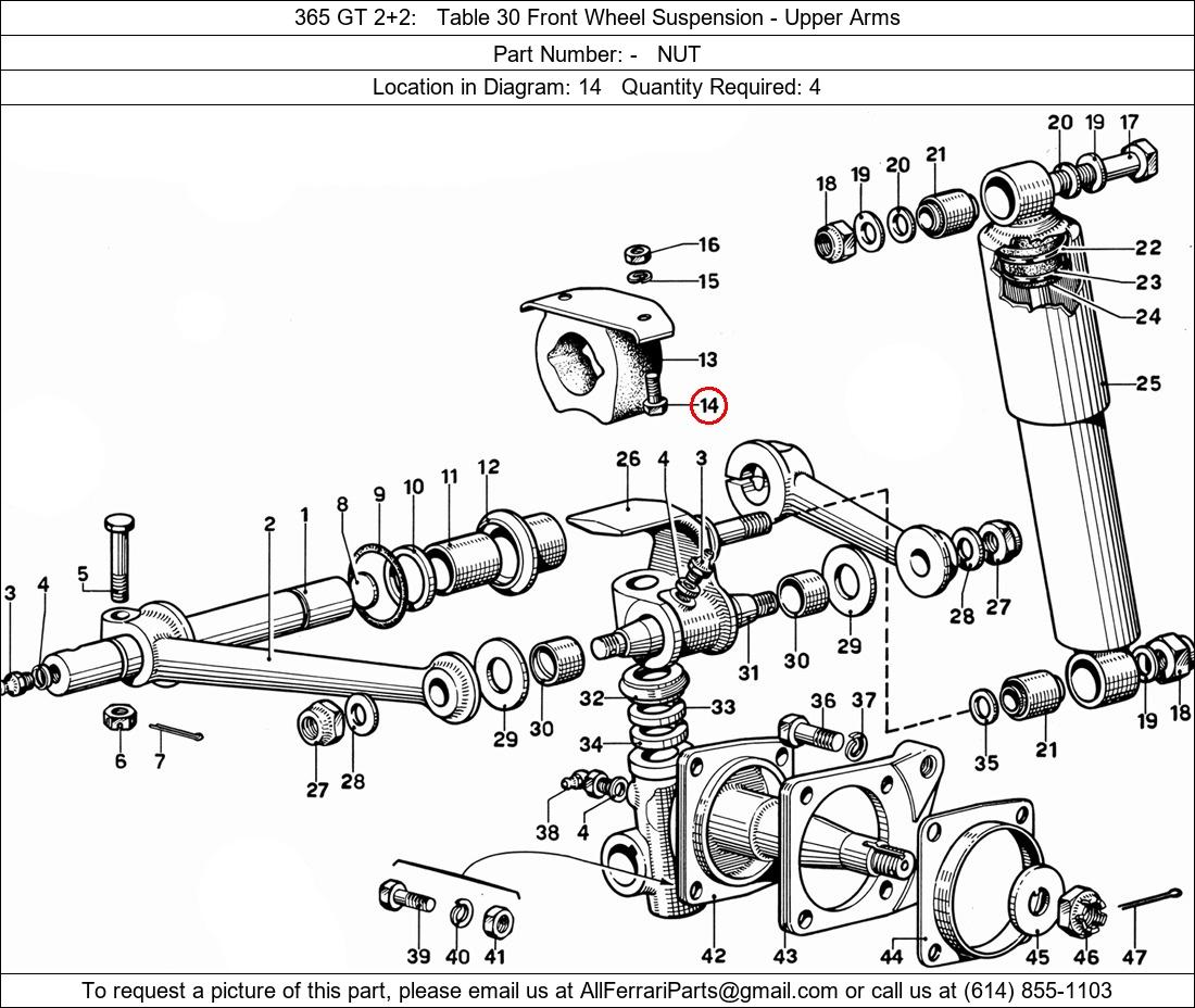 Ferrari Part Number -, NUT shown here as used in 365 GT 2+2 Table 30 Front Wheel Suspension - Upper Arms. Location in Diagram: 14. Required Quantity: 4