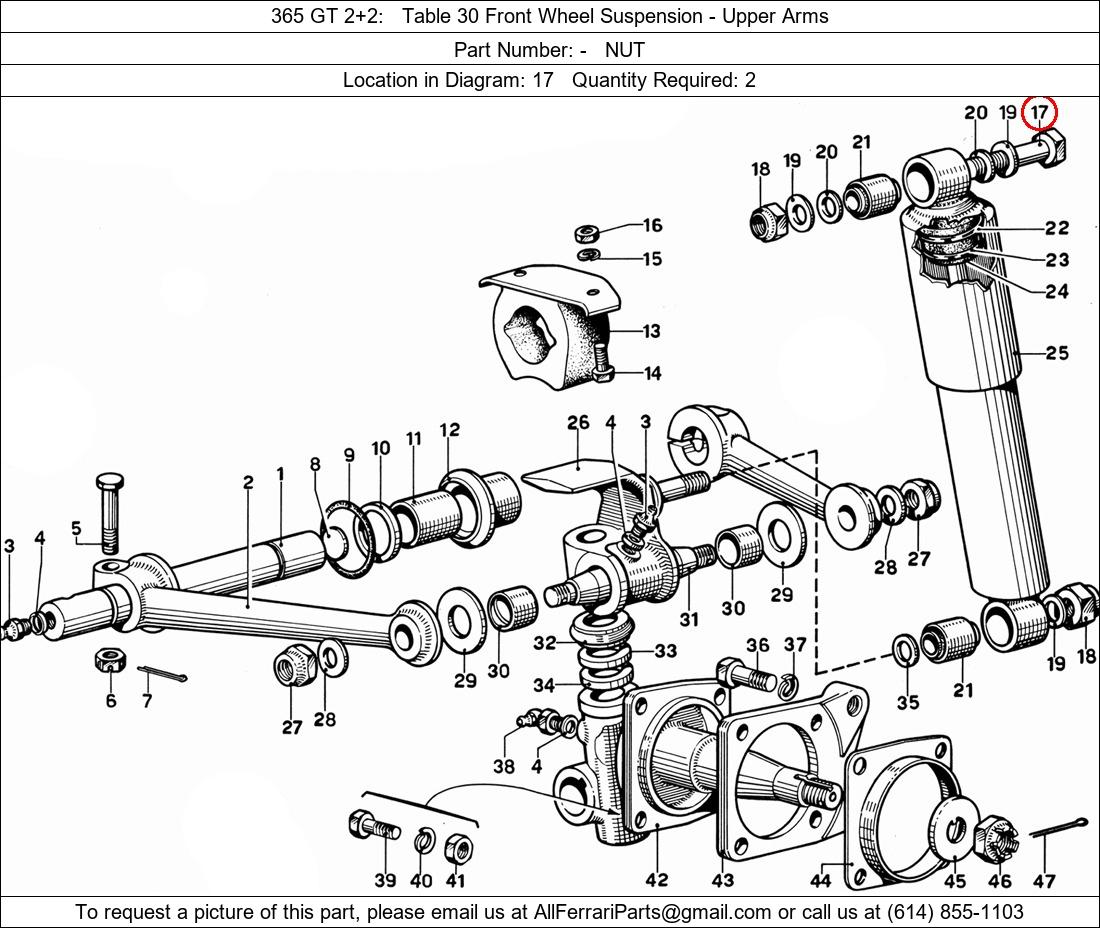 Ferrari Part Number -, NUT shown here as used in 365 GT 2+2 Table 30 Front Wheel Suspension - Upper Arms. Location in Diagram: 17. Required Quantity: 2