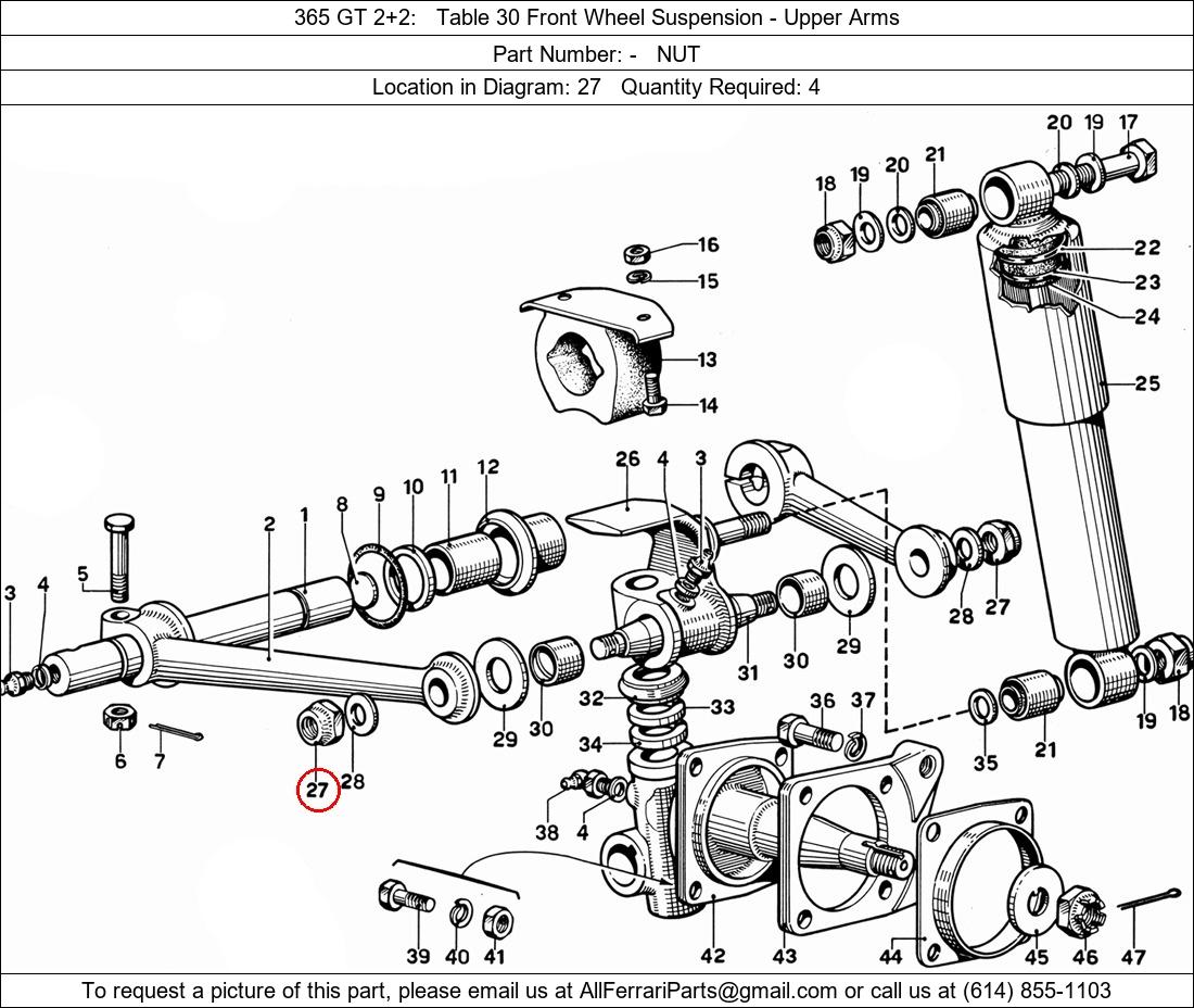 Ferrari Part Number -, NUT shown here as used in 365 GT 2+2 Table 30 Front Wheel Suspension - Upper Arms. Location in Diagram: 27. Required Quantity: 4
