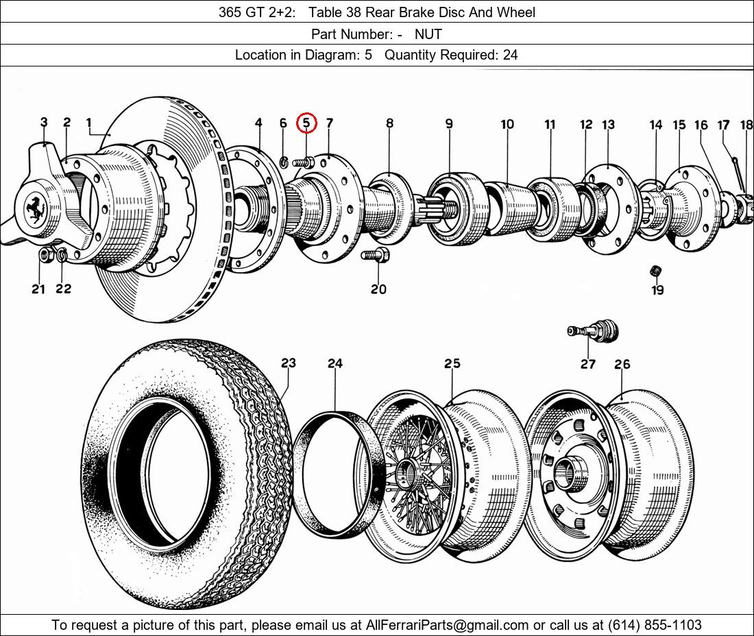 Ferrari Part Number -, NUT shown here as used in 365 GT 2+2 Table 38 Rear Brake Disc And Wheel. Location in Diagram: 5. Required Quantity: 24