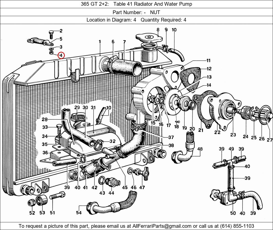 Ferrari Part Number -, NUT shown here as used in 365 GT 2+2 Table 41 Radiator And Water Pump. Location in Diagram: 4. Required Quantity: 4