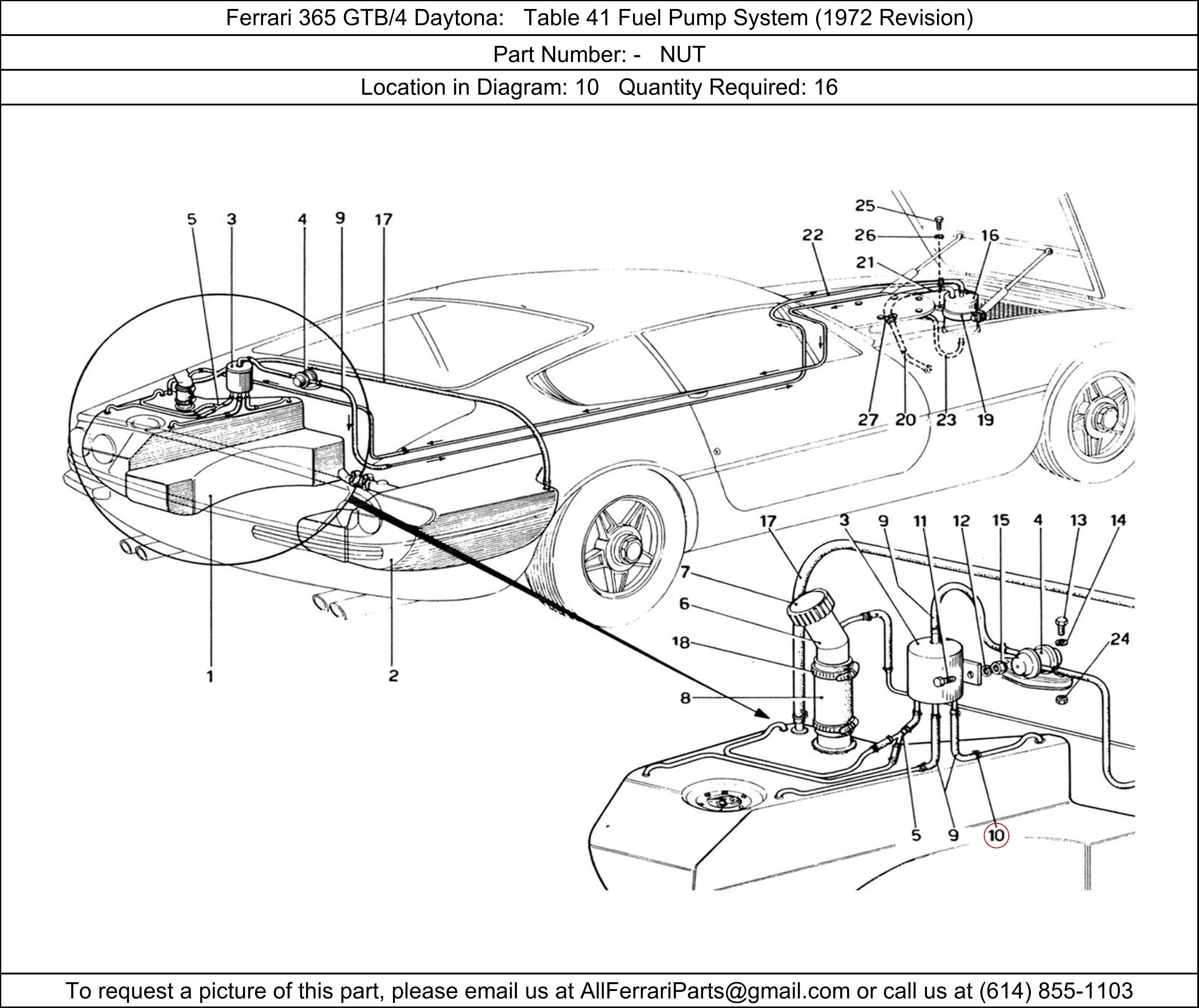 Ferrari Part Number -, NUT shown here as used in Ferrari 365 GTB/4 Daytona Table 41 Fuel Pump System (1972 Revision). Location in Diagram: 10. Required Quantity: 16