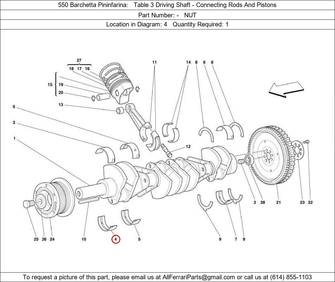 Ferrari Part Number -, NUT shown here as used in 550 Barchetta Pininfarina Table 3 Driving Shaft - Connecting Rods And Pistons. Location in Diagram: 4. Required Quantity: 1