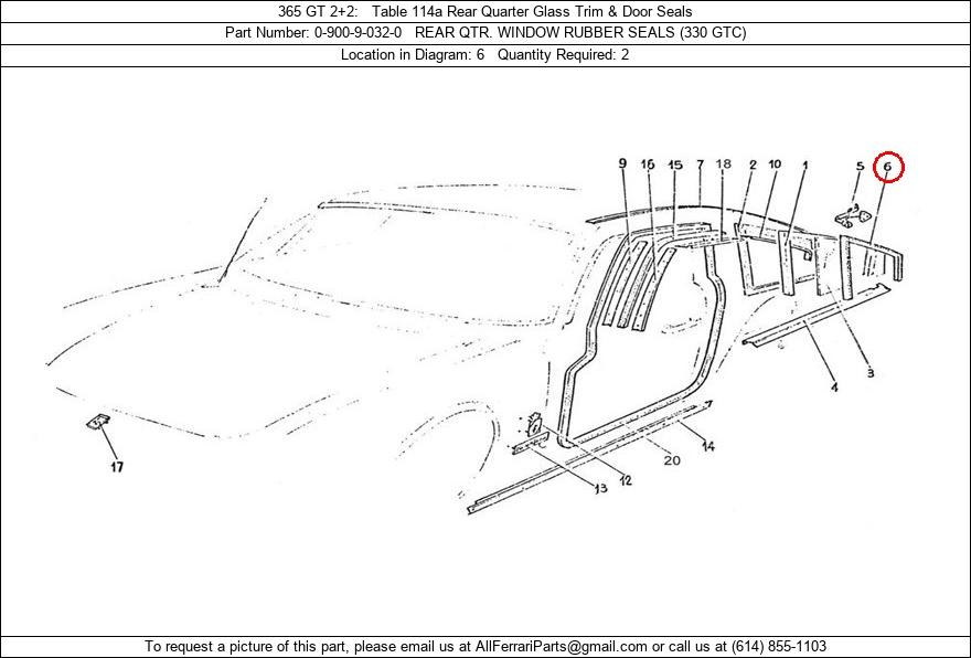 Ferrari Part Number 0-900-9-032-0, REAR QTR. WINDOW RUBBER SEALS (330 GTC) shown here as used in 365 GT 2+2 Table 114a Rear Quarter Glass Trim & Door Seals. Location in Diagram: 6. Required Quantity: 2. This Ferrari part is used in more than one diagram. Click on the diagrams below to see alternative uses of this part: