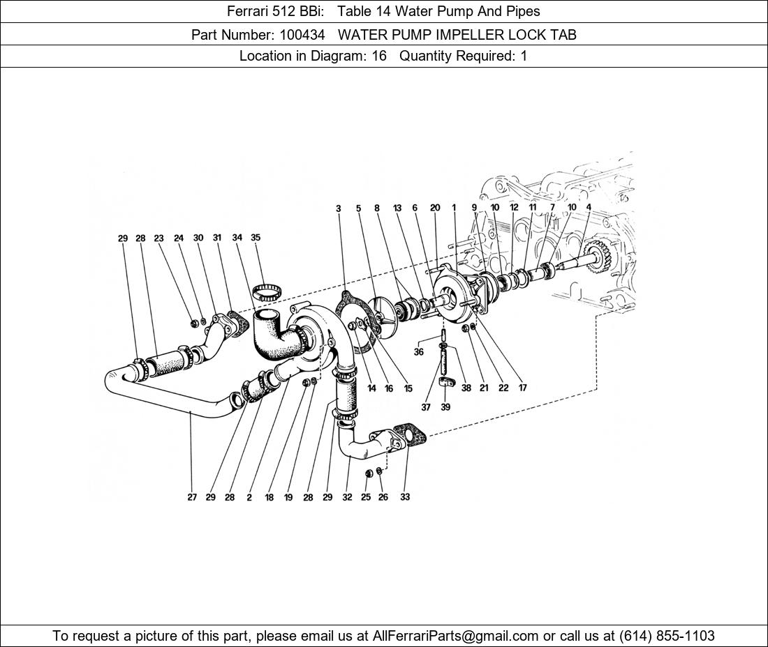 Ferrari Part 100434, WATER PUMP IMPELLER LOCK TAB, shown here as used in Ferrari 512 BBi Table 14 Water Pump And Pipes. Other uses of this part are shown below: