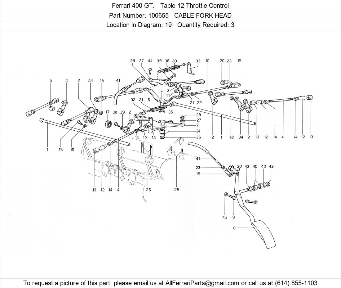 Ferrari Part 100655, CABLE FORK HEAD, shown here as used in Ferrari 400 GT Table 12 Throttle Control. Other uses of this part are shown below: