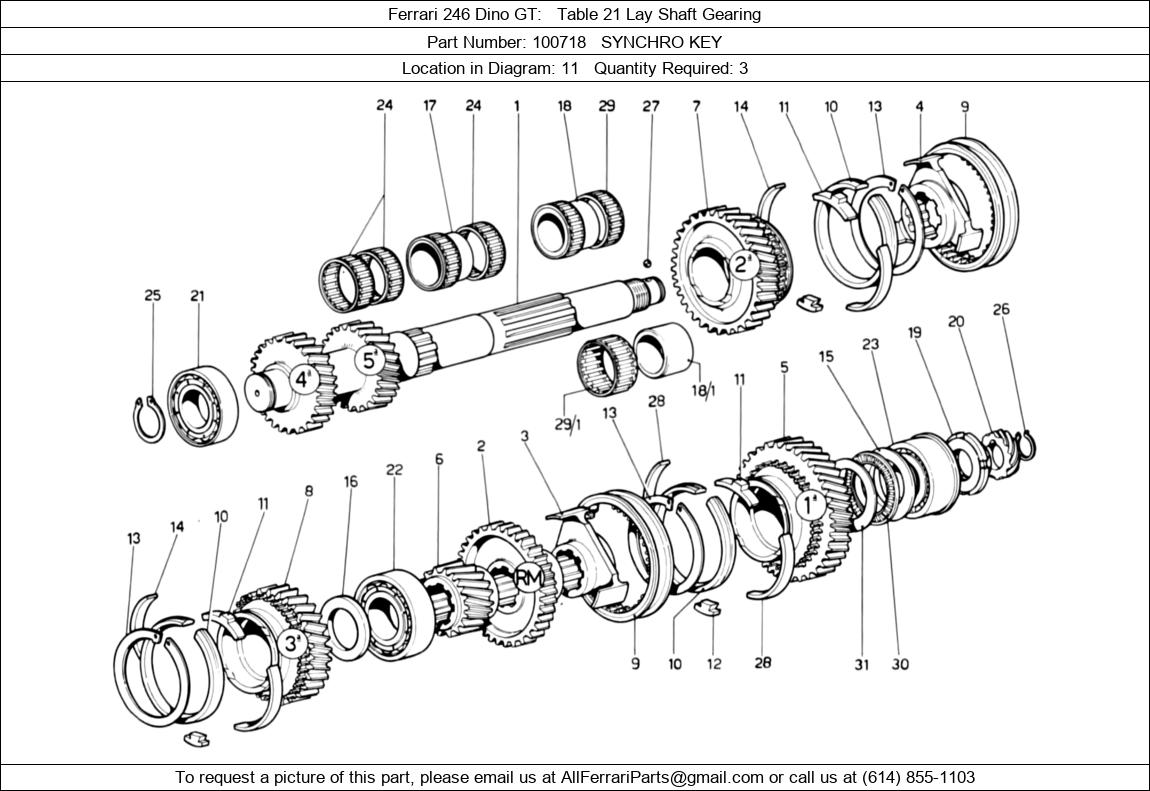 Ferrari Part 100718, SYNCHRO KEY, shown here as used in Ferrari 246 Dino GT Table 21 Lay Shaft Gearing. Other uses of this part are shown below: