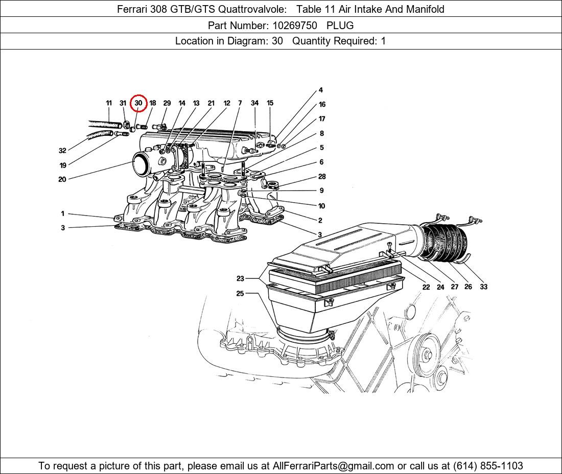 Ferrari Part Number 10269750, PLUG shown here as used in Ferrari 308 GTB/GTS Quattrovalvole Table 11 Air Intake And Manifold. Location in Diagram: 30. Required Quantity: 1. This Ferrari part is used in more than one diagram. Click on the diagrams below to see alternative uses of this part: