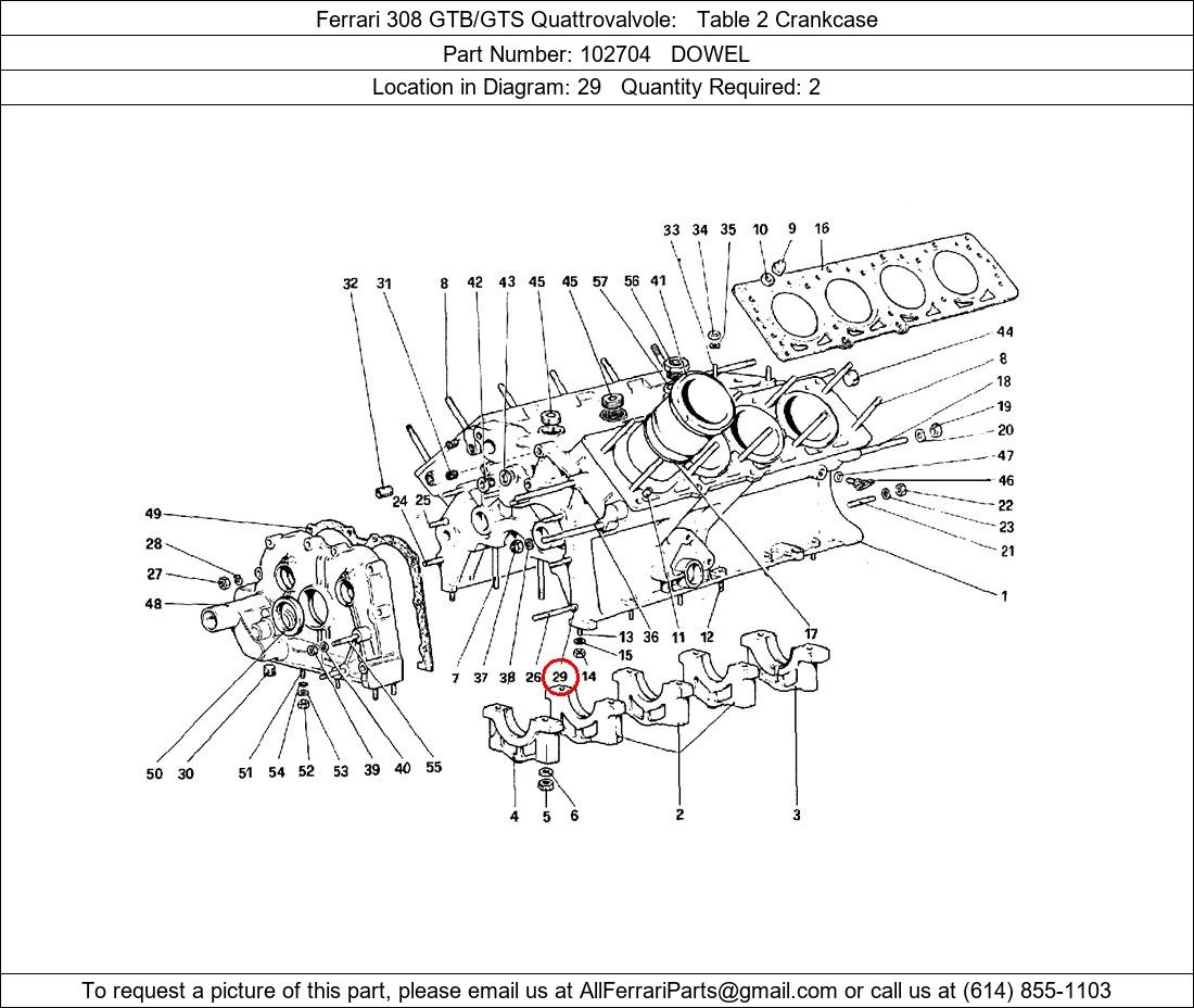 Ferrari Part Number 102704, DOWEL shown here as used in Ferrari 308 GTB/GTS Quattrovalvole Table 2 Crankcase. Location in Diagram: 29. Required Quantity: 2. This Ferrari part is used in more than one diagram. Click on the diagrams below to see alternative uses of this part: