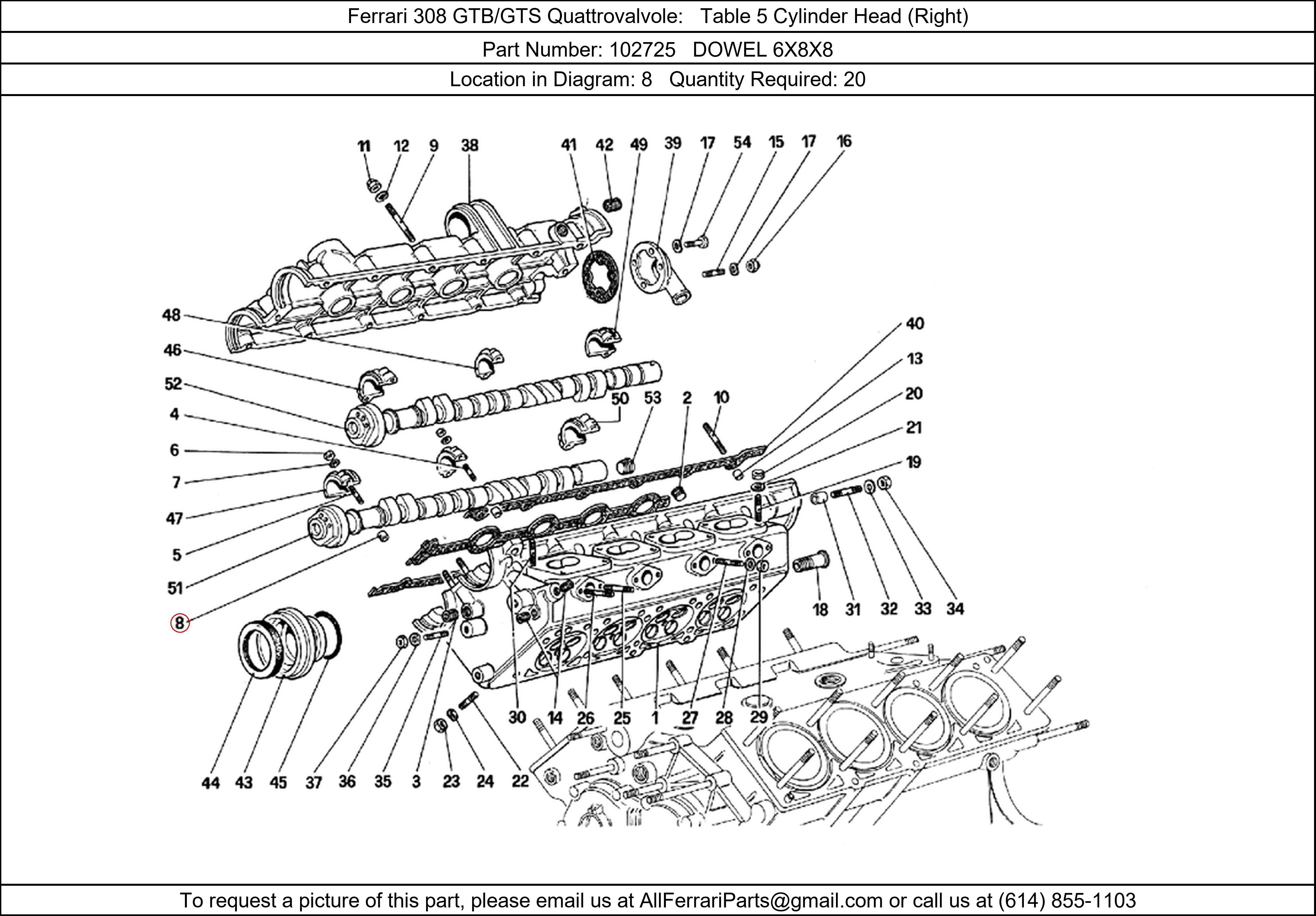Ferrari Part Number 102725, DOWEL 6X8X8 shown here as used in Ferrari 308 GTB/GTS Quattrovalvole Table 5 Cylinder Head (Right). Location in Diagram: 8. Required Quantity: 20. This Ferrari part is used in more than one diagram. Click on the diagrams below to see alternative uses of this part: