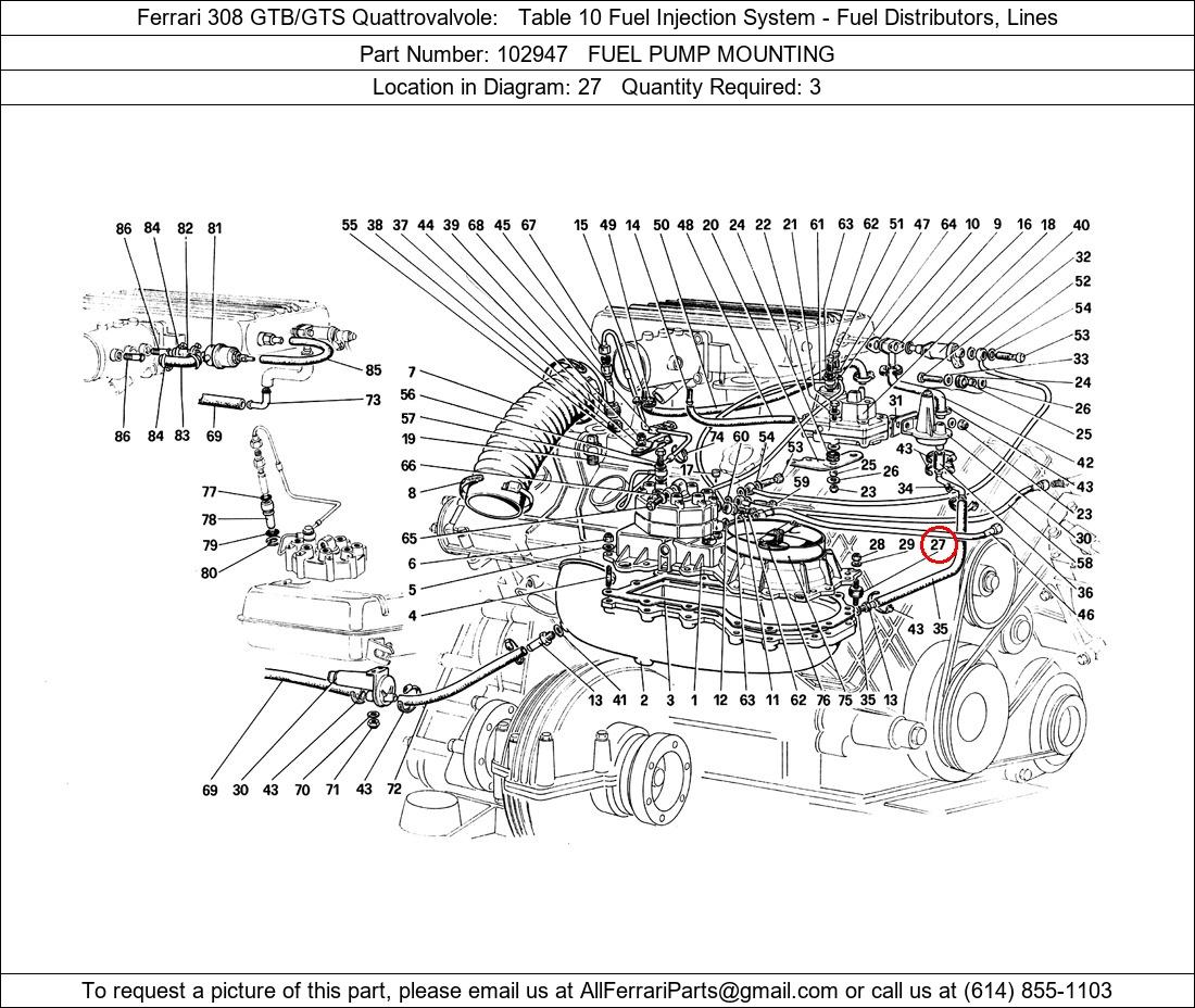Ferrari Part Number 102947, FUEL PUMP MOUNTING shown here as used in Ferrari 308 GTB/GTS Quattrovalvole Table 10 Fuel Injection System - Fuel Distributors, Lines. Location in Diagram: 27. Required Quantity: 3. This Ferrari part is used in more than one diagram. Click on the diagrams below to see alternative uses of this part: