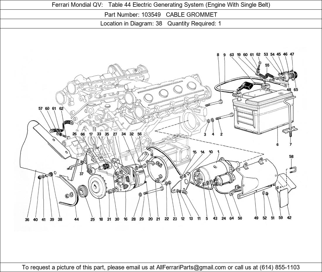 Ferrari Part 103549, CABLE GROMMET, shown here as used in Ferrari Mondial QV Table 44 Electric Generating System (Engine With Single Belt). Other uses of this part are shown below:
