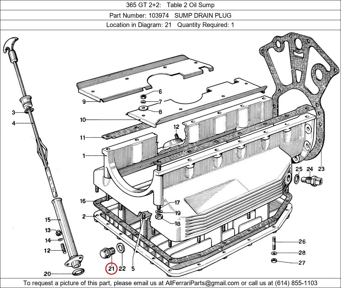 Ferrari Part Number 103974, SUMP DRAIN PLUG shown here as used in 365 GT 2+2 Table 2 Oil Sump. Location in Diagram: 21. Required Quantity: 1. This Ferrari part is used in more than one diagram. Click on the diagrams below to see alternative uses of this part: