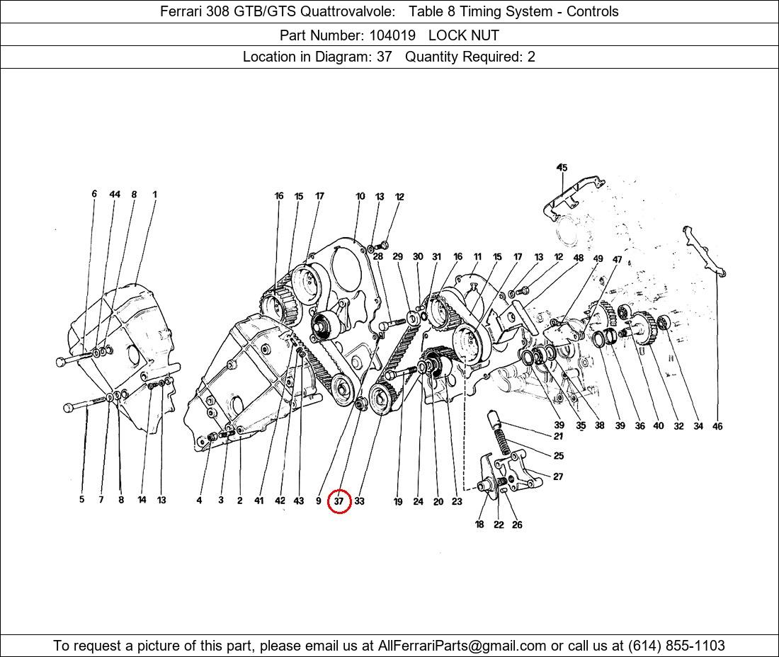 Ferrari Part Number 104019, LOCK NUT shown here as used in Ferrari 308 GTB/GTS Quattrovalvole Table 8 Timing System - Controls. Location in Diagram: 37. Required Quantity: 2. This Ferrari part is used in more than one diagram. Click on the diagrams below to see alternative uses of this part: