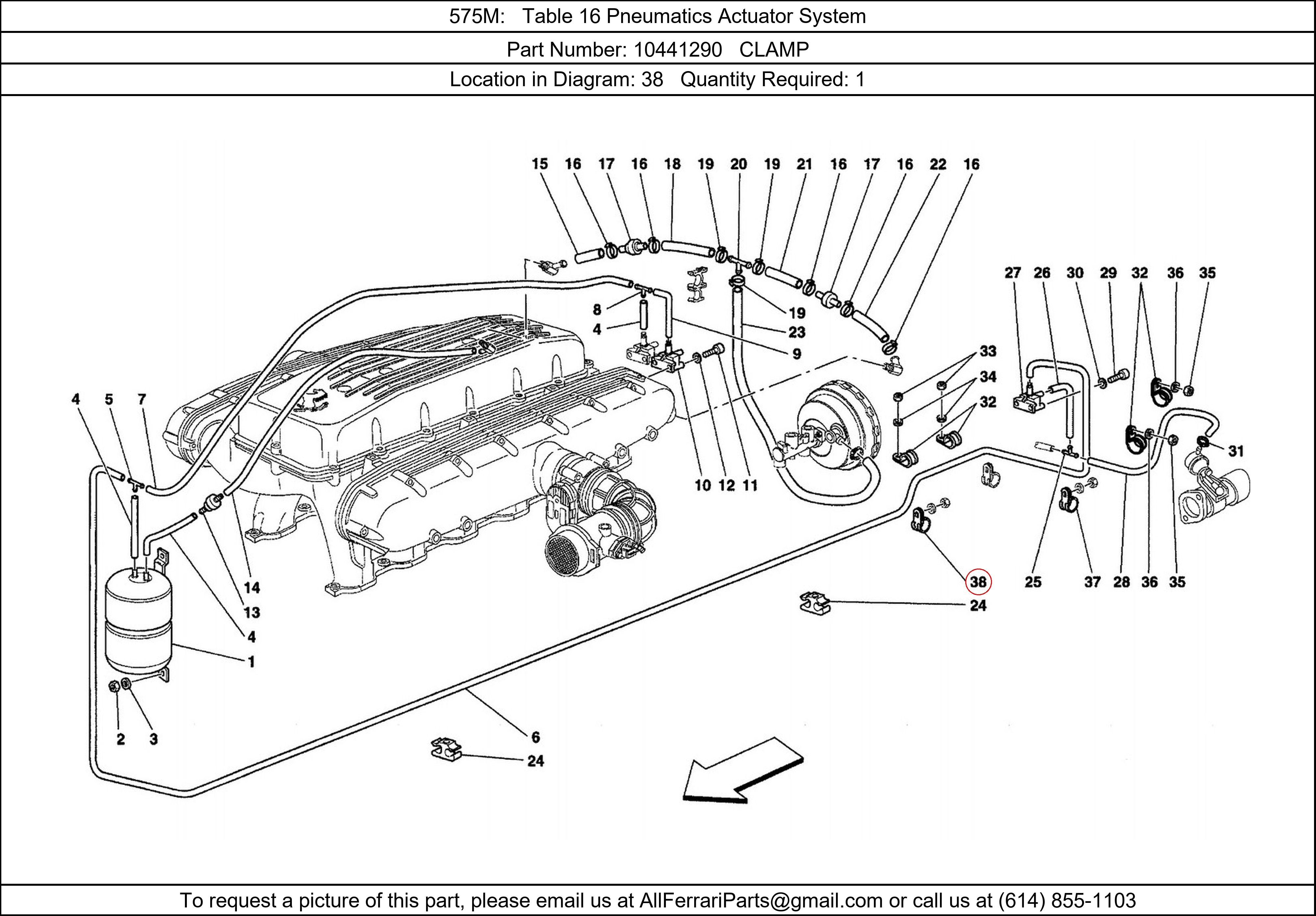 Ferrari Part Number 10441290, CLAMP shown here as used in 575M Table 16 Pneumatics Actuator System. Location in Diagram: 38. Required Quantity: 1. This Ferrari part is used in more than one diagram. Click on the diagrams below to see alternative uses of this part: