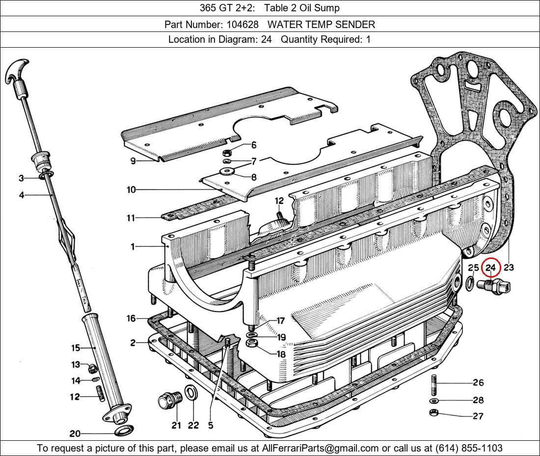 Ferrari Part Number 104628, WATER TEMP SENDER shown here as used in 365 GT 2+2 Table 2 Oil Sump. Location in Diagram: 24. Required Quantity: 1. This Ferrari part is used in more than one diagram. Click on the diagrams below to see alternative uses of this part: