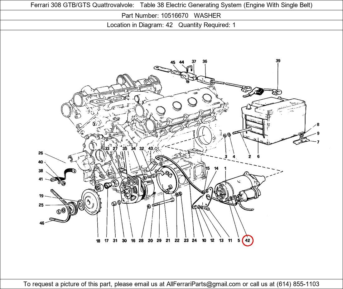 Ferrari Part Number 10516670, WASHER shown here as used in Ferrari 308 GTB/GTS Quattrovalvole Table 38 Electric Generating System (Engine With Single Belt). Location in Diagram: 42. Required Quantity: 1. This Ferrari part is used in more than one diagram. Click on the diagrams below to see alternative uses of this part: