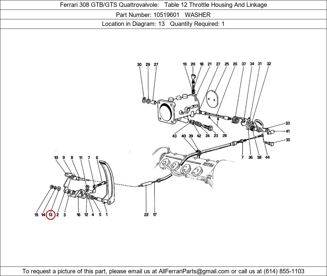 Ferrari Part Number 10519601, WASHER shown here as used in Ferrari 308 GTB/GTS Quattrovalvole Table 12 Throttle Housing And Linkage. Location in Diagram: 13. Required Quantity: 1. This Ferrari part is used in more than one diagram. Click on the diagrams below to see alternative uses of this part: