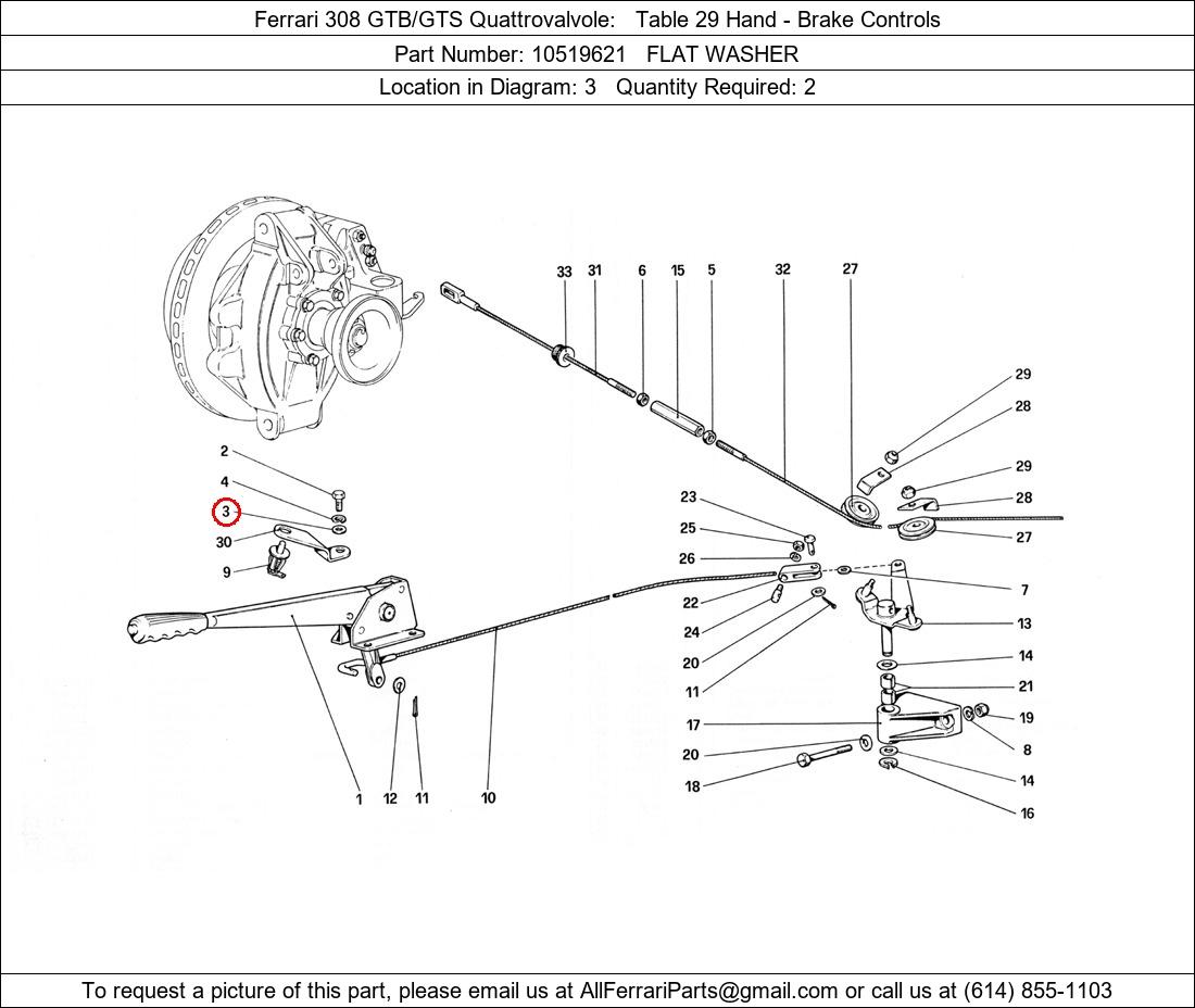 Ferrari Part Number 10519621, FLAT WASHER shown here as used in Ferrari 308 GTB/GTS Quattrovalvole Table 29 Hand - Brake Controls. Location in Diagram: 3. Required Quantity: 2. This Ferrari part is used in more than one diagram. Click on the diagrams below to see alternative uses of this part: