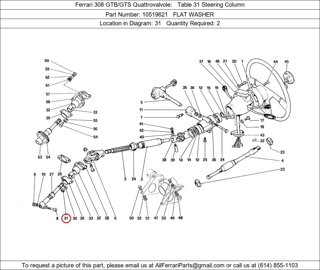 Ferrari Part Number 10519621, FLAT WASHER shown here as used in Ferrari 308 GTB/GTS Quattrovalvole Table 31 Steering Column. Location in Diagram: 31. Required Quantity: 2. This Ferrari part is used in more than one diagram. Click on the diagrams below to see alternative uses of this part: