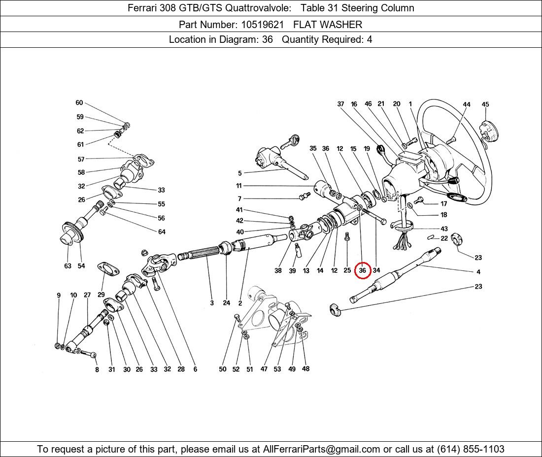 Ferrari Part Number 10519621, FLAT WASHER shown here as used in Ferrari 308 GTB/GTS Quattrovalvole Table 31 Steering Column. Location in Diagram: 36. Required Quantity: 4. This Ferrari part is used in more than one diagram. Click on the diagrams below to see alternative uses of this part: