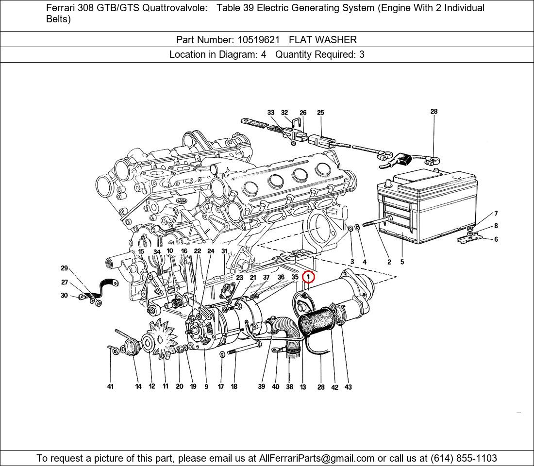 Ferrari Part Number 10519621, FLAT WASHER shown here as used in Ferrari 308 GTB/GTS Quattrovalvole Table 39 Electric Generating System (Engine With 2 Individual Belts). Location in Diagram: 4. Required Quantity: 3. This Ferrari part is used in more than one diagram. Click on the diagrams below to see alternative uses of this part: