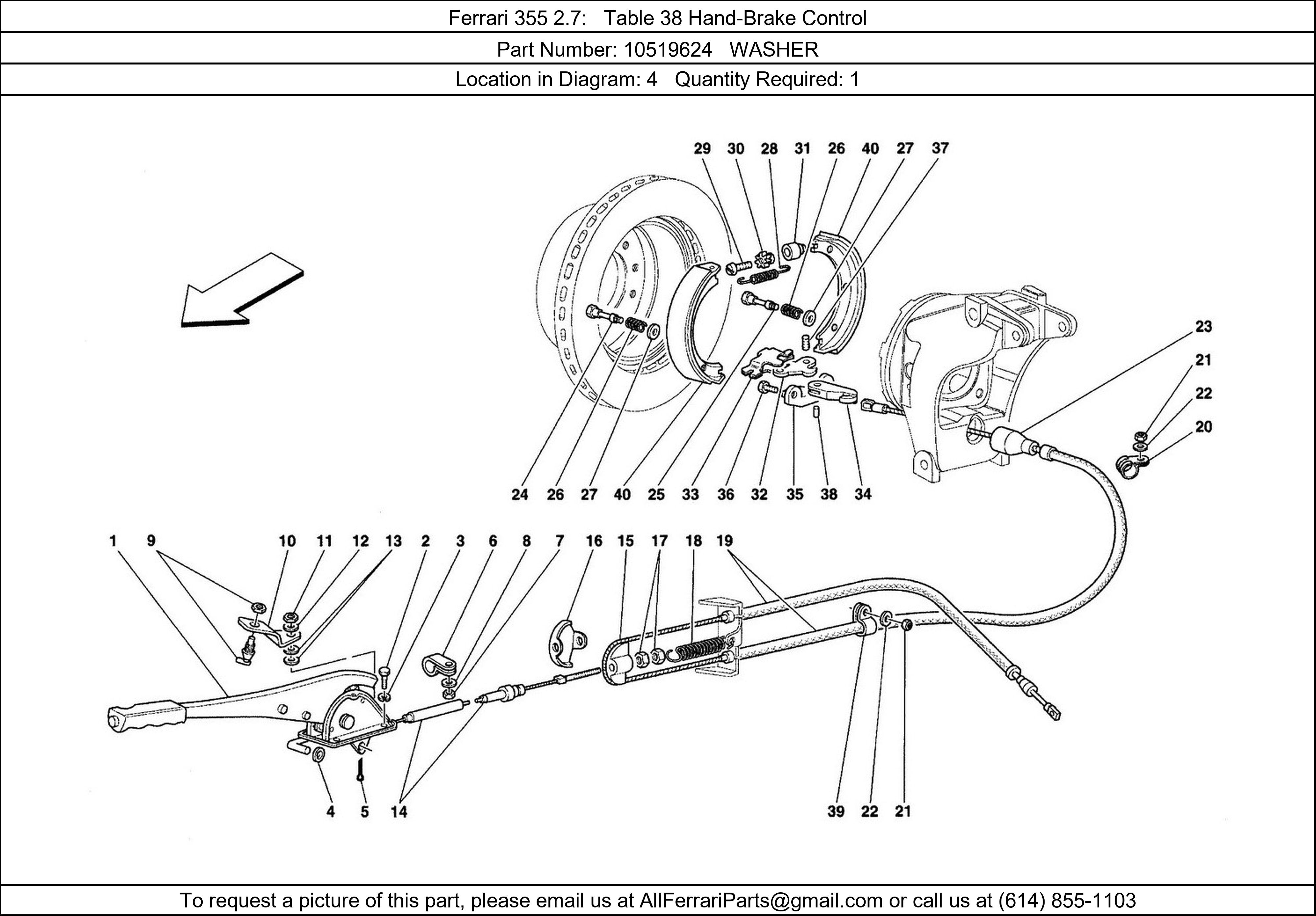 Ferrari Part 10519624, WASHER, shown here as used in Ferrari 355 2.7 Table 38 Hand-Brake Control. Other uses of this part are shown below: