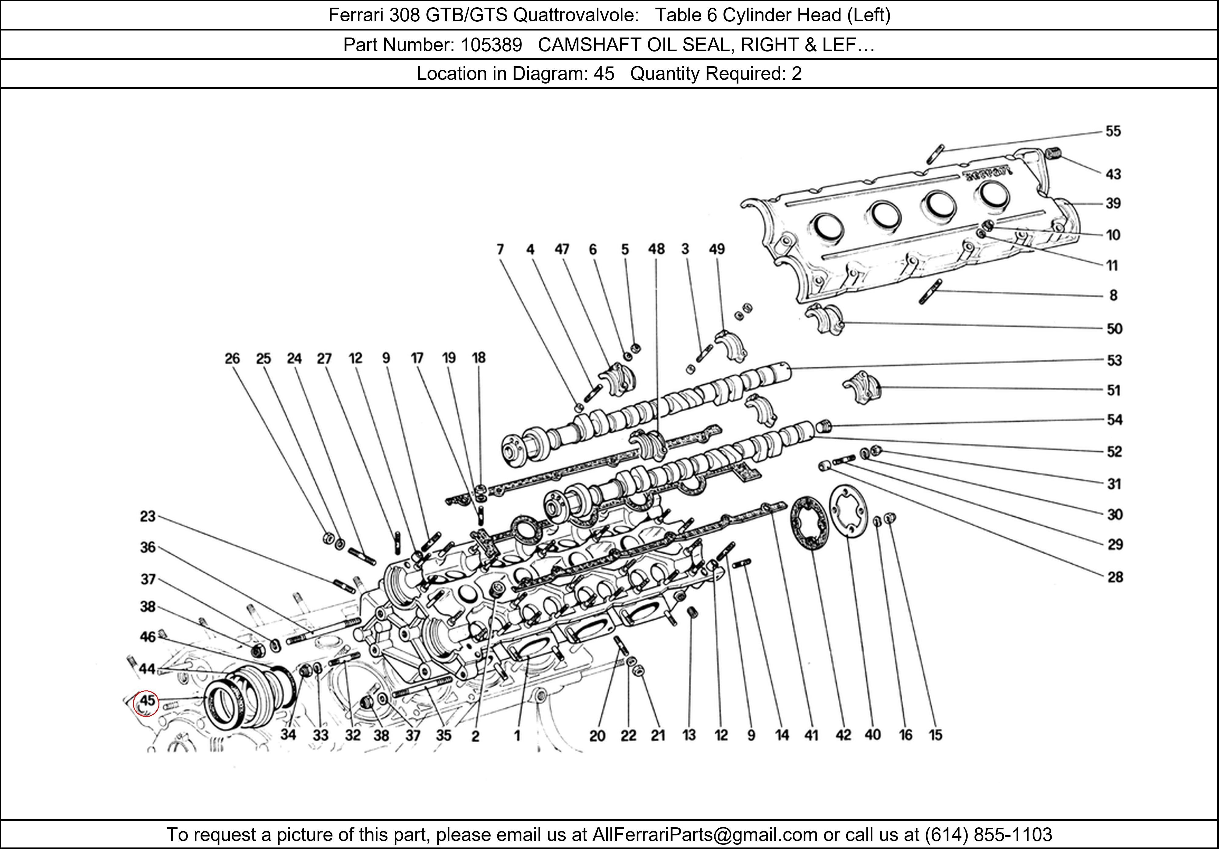 Ferrari Part Number 105389, CAMSHAFT OIL SEAL, RIGHT & LEF… shown here as used in Ferrari 308 GTB/GTS Quattrovalvole Table 6 Cylinder Head (Left). Location in Diagram: 45. Required Quantity: 2. This Ferrari part is used in more than one diagram. Click on the diagrams below to see alternative uses of this part: