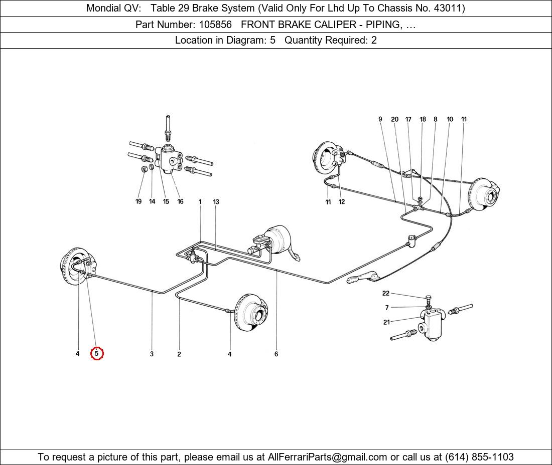 Ferrari Part Number 105856, FRONT BRAKE CALIPER - PIPING, … shown here as used in Mondial QV Table 29 Brake System (Valid Only For Lhd Up To Chassis No. 43011). Location in Diagram: 5. Required Quantity: 2. This Ferrari part is used in more than one diagram. Click on the diagrams below to see alternative uses of this part: