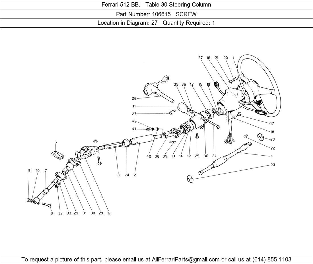 Ferrari Part 106615, SCREW, shown here as used in Ferrari 512 BB Table 30 Steering Column. Other uses of this part are shown below: