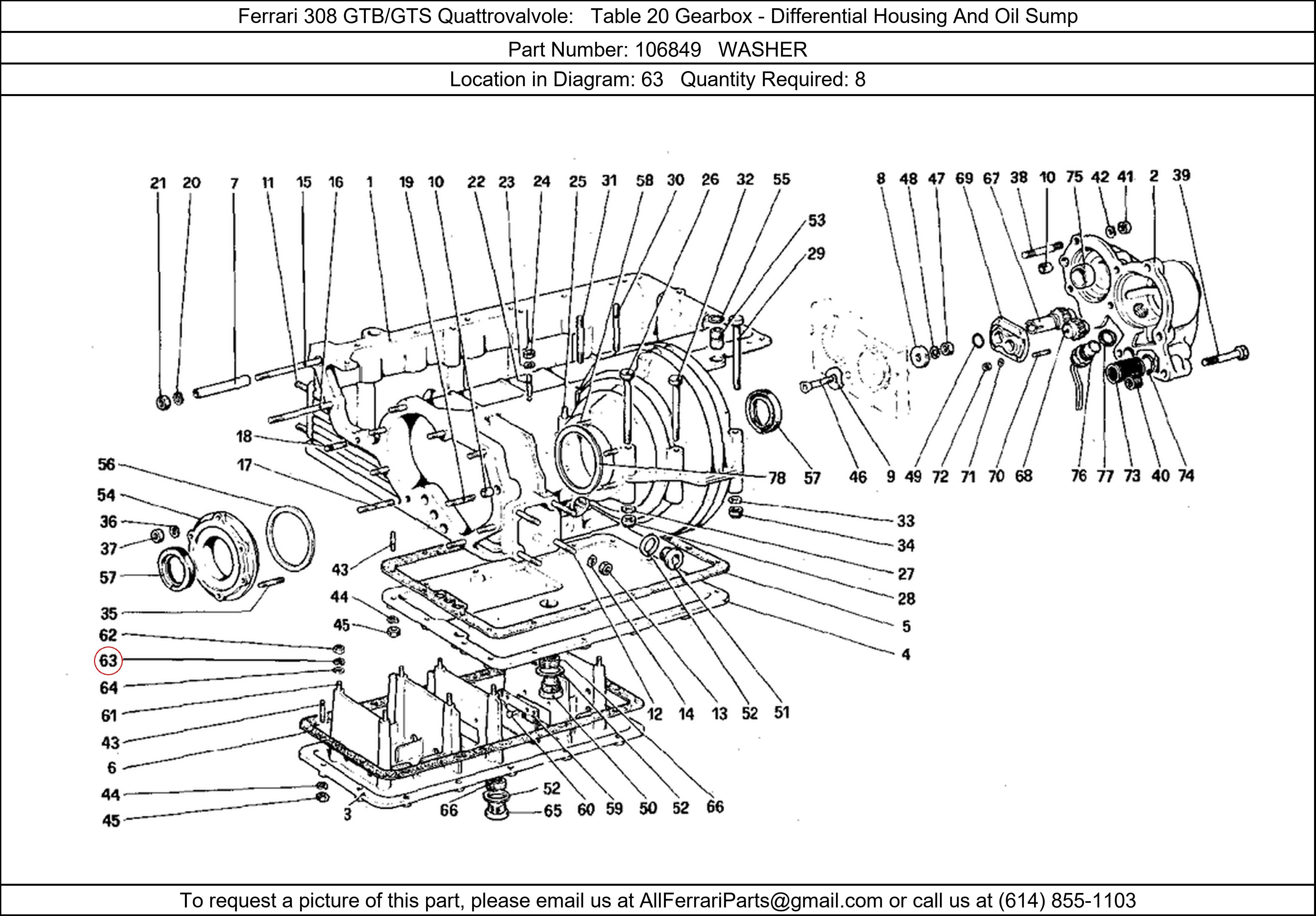 Ferrari Part Number 106849, WASHER shown here as used in Ferrari 308 GTB/GTS Quattrovalvole Table 20 Gearbox - Differential Housing And Oil Sump. Location in Diagram: 63. Required Quantity: 8. This Ferrari part is used in more than one diagram. Click on the diagrams below to see alternative uses of this part: