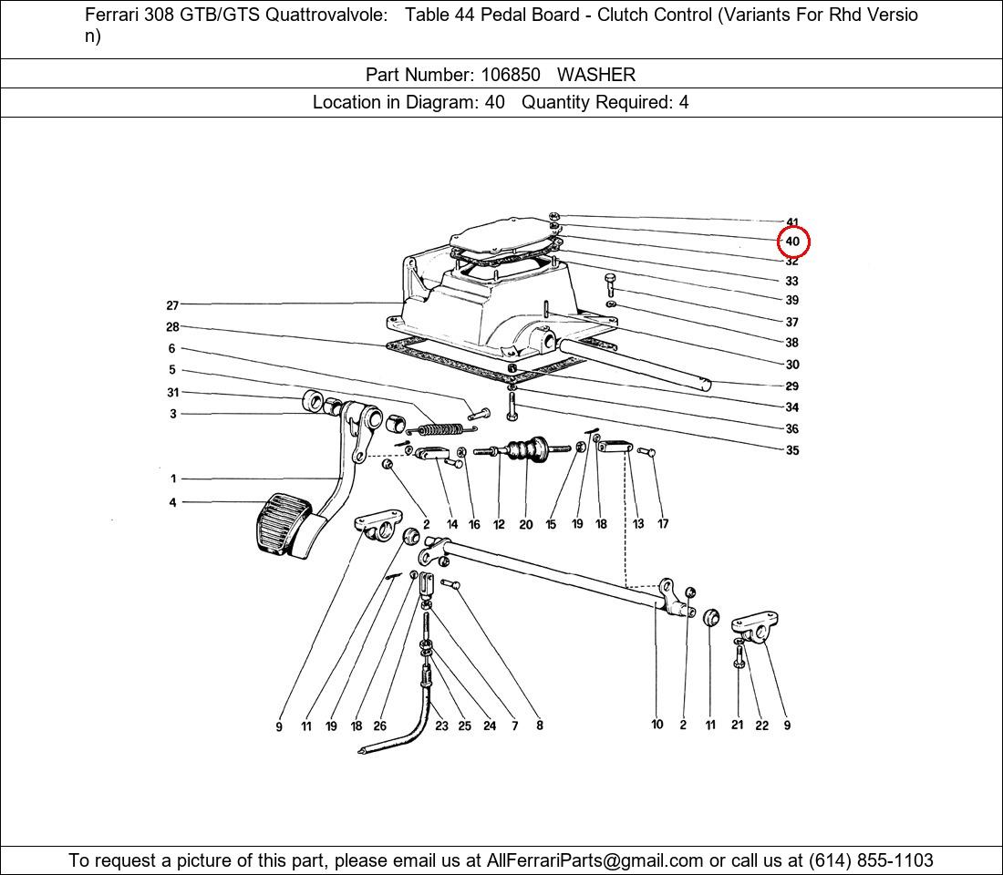 Ferrari Part Number 106850, WASHER shown here as used in Ferrari 308 GTB/GTS Quattrovalvole Table 44 Pedal Board - Clutch Control (Variants For Rhd Version). Location in Diagram: 40. Required Quantity: 4. This Ferrari part is used in more than one diagram. Click on the diagrams below to see alternative uses of this part: