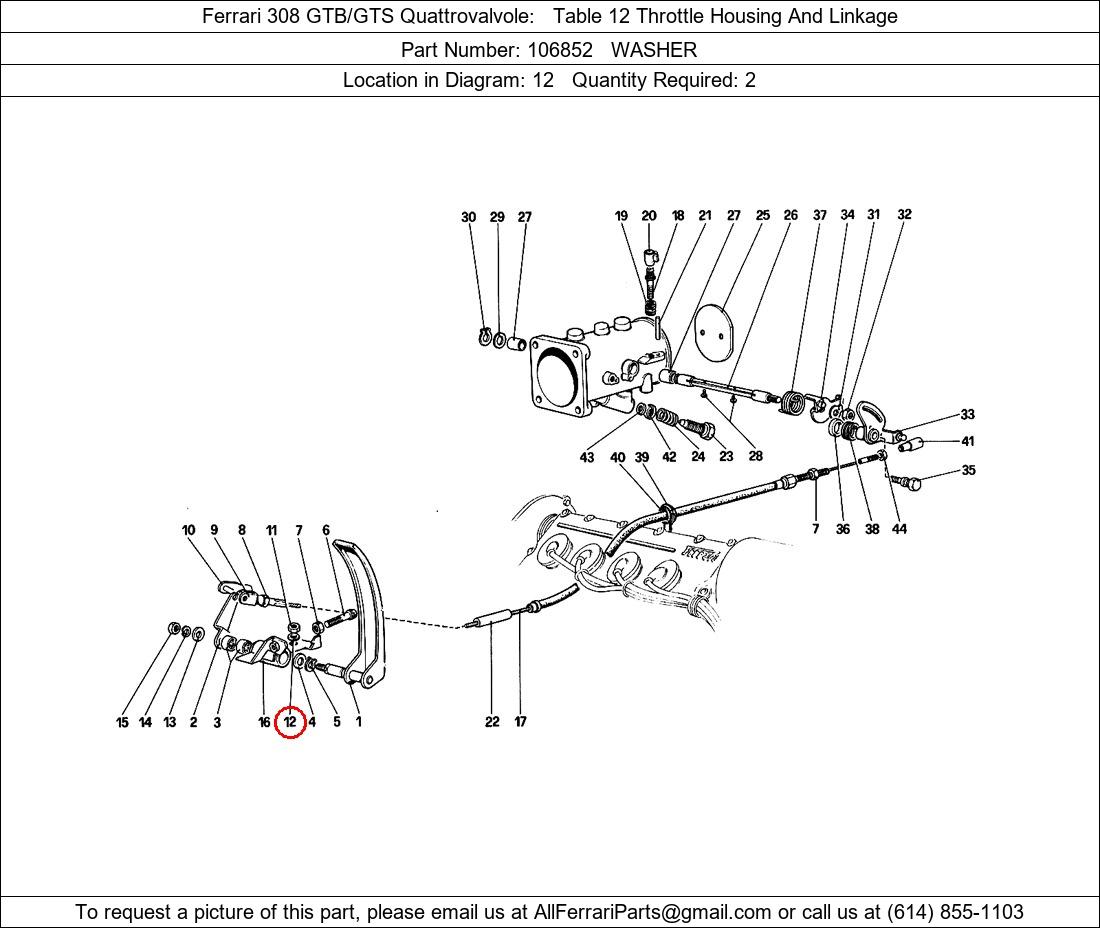 Ferrari Part Number 106852, WASHER shown here as used in Ferrari 308 GTB/GTS Quattrovalvole Table 12 Throttle Housing And Linkage. Location in Diagram: 12. Required Quantity: 2. This Ferrari part is used in more than one diagram. Click on the diagrams below to see alternative uses of this part:
