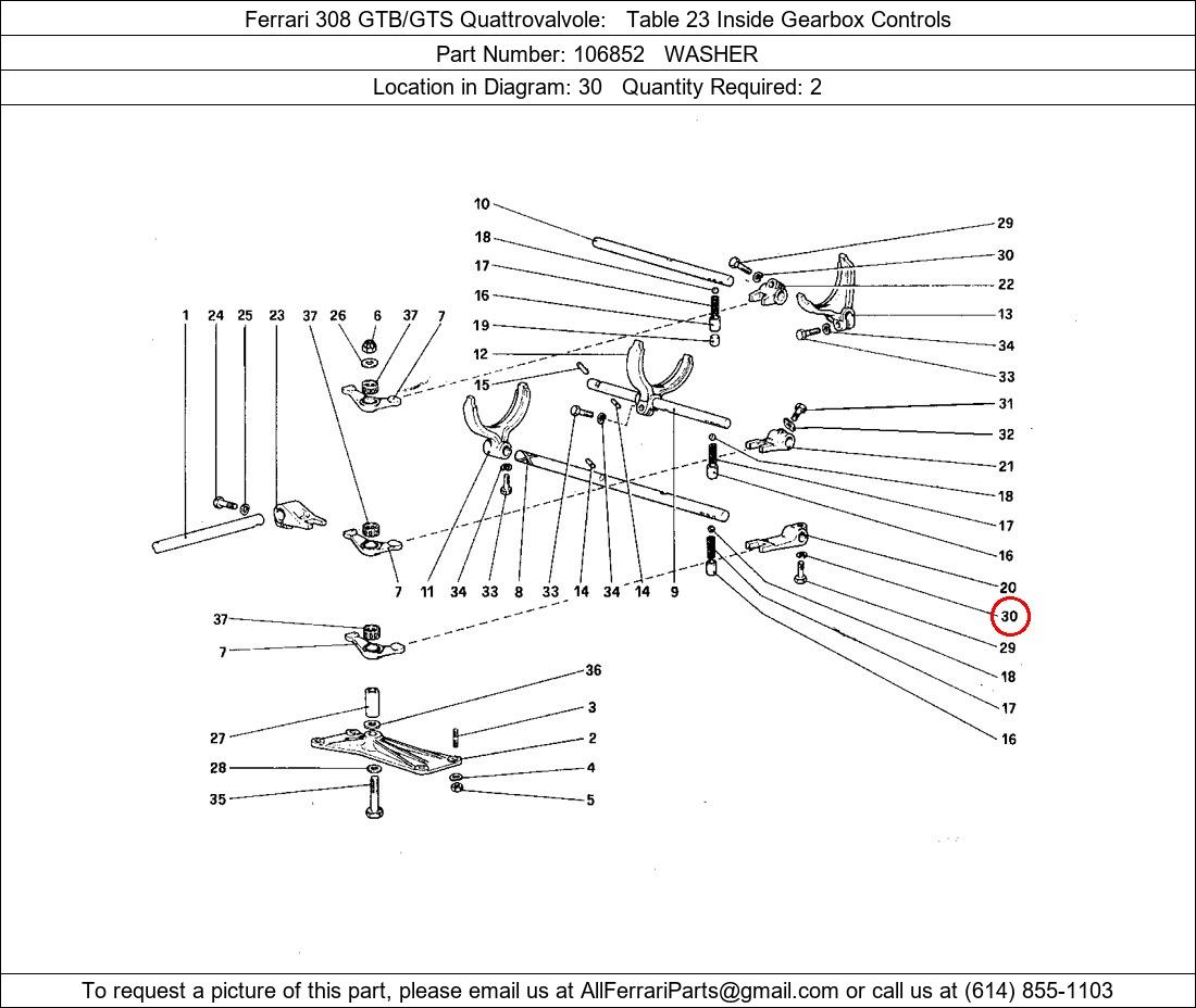 Ferrari Part Number 106852, WASHER shown here as used in Ferrari 308 GTB/GTS Quattrovalvole Table 23 Inside Gearbox Controls. Location in Diagram: 30. Required Quantity: 2. This Ferrari part is used in more than one diagram. Click on the diagrams below to see alternative uses of this part: