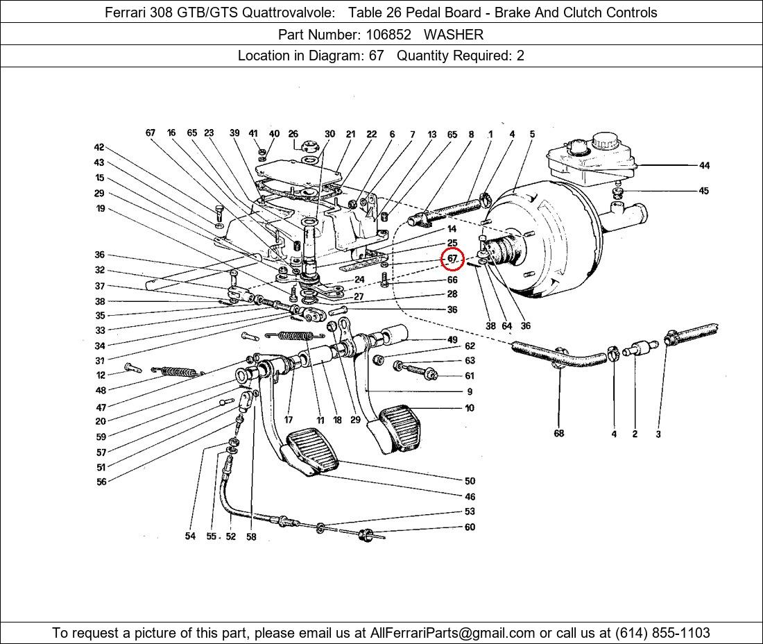 Ferrari Part Number 106852, WASHER shown here as used in Ferrari 308 GTB/GTS Quattrovalvole Table 26 Pedal Board - Brake And Clutch Controls. Location in Diagram: 67. Required Quantity: 2. This Ferrari part is used in more than one diagram. Click on the diagrams below to see alternative uses of this part: