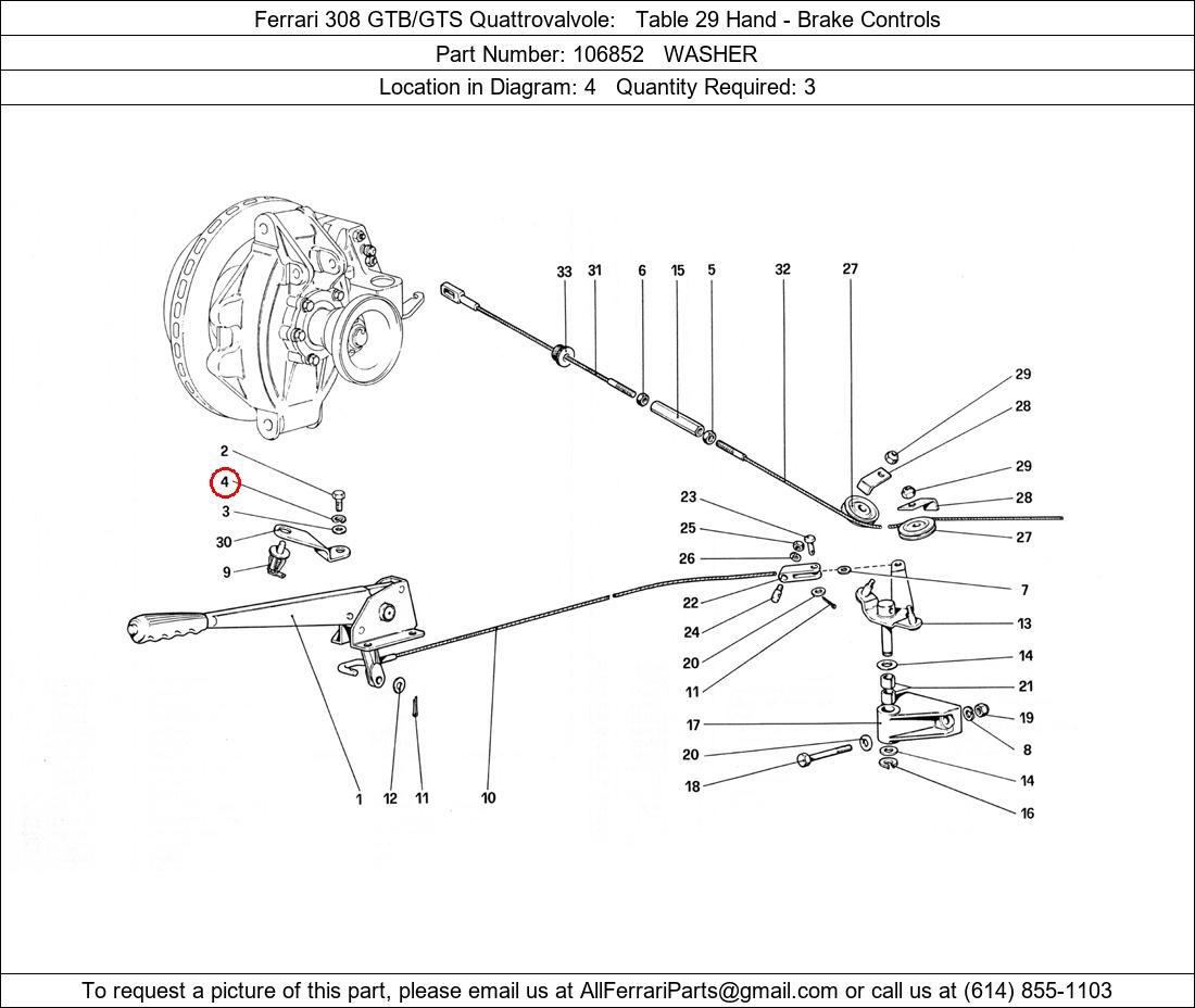 Ferrari Part Number 106852, WASHER shown here as used in Ferrari 308 GTB/GTS Quattrovalvole Table 29 Hand - Brake Controls. Location in Diagram: 4. Required Quantity: 3. This Ferrari part is used in more than one diagram. Click on the diagrams below to see alternative uses of this part: