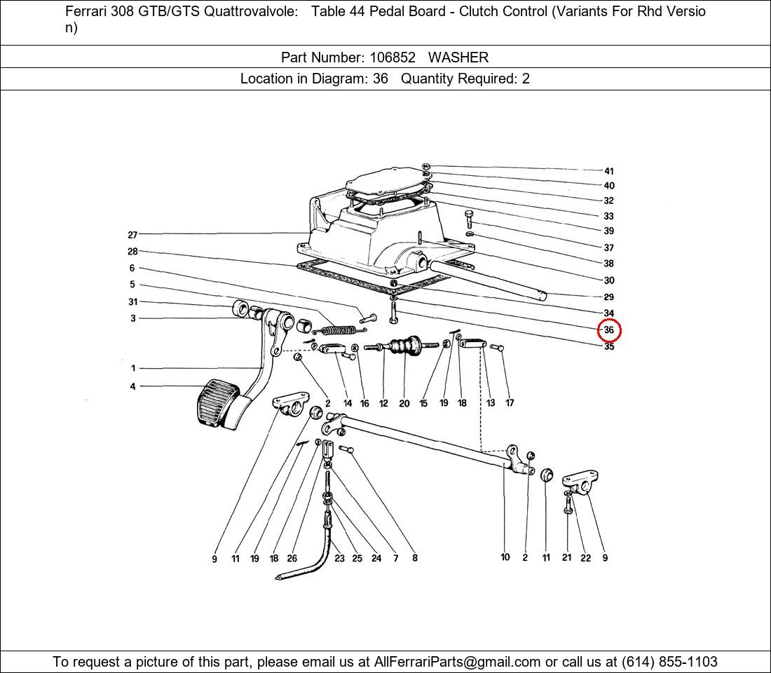 Ferrari Part Number 106852, WASHER shown here as used in Ferrari 308 GTB/GTS Quattrovalvole Table 44 Pedal Board - Clutch Control (Variants For Rhd Version). Location in Diagram: 36. Required Quantity: 2. This Ferrari part is used in more than one diagram. Click on the diagrams below to see alternative uses of this part: